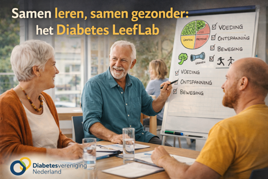 Het Diabetes LeefLab is een reeks bijeenkomsten waarin mensen met diabetes – met name type 2 – ervaringsverhalen delen over leefstijl. Thema’s als gezond eten, bewegen, slapen en ontspannen staan centraal. Deelnemers wisselen ervaringen uit, leren van elkaar en krijgen praktische handvatten om stap voor stap gezonder te leven.